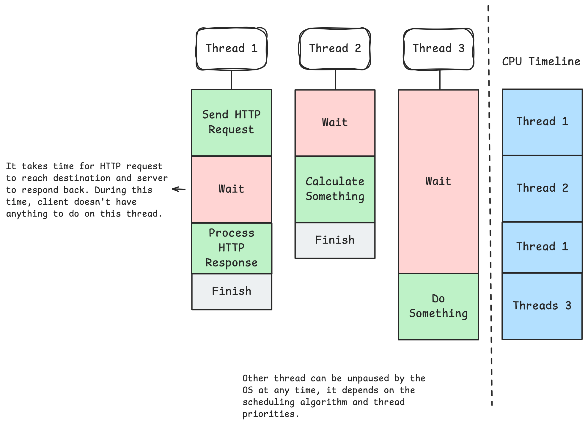 The core issue with 10 user concurrency is the amount of time it takes when you call send notifications. If sending notifications took only a couple CPU cycles, running 10 threads would be more than enough! But our assumption of sending notification taking couple CPU cycles is wrong, in reality, those send notification calls are usually happening over network and takes a long time as we discussed. During those network calls, our threads would be blocked.
