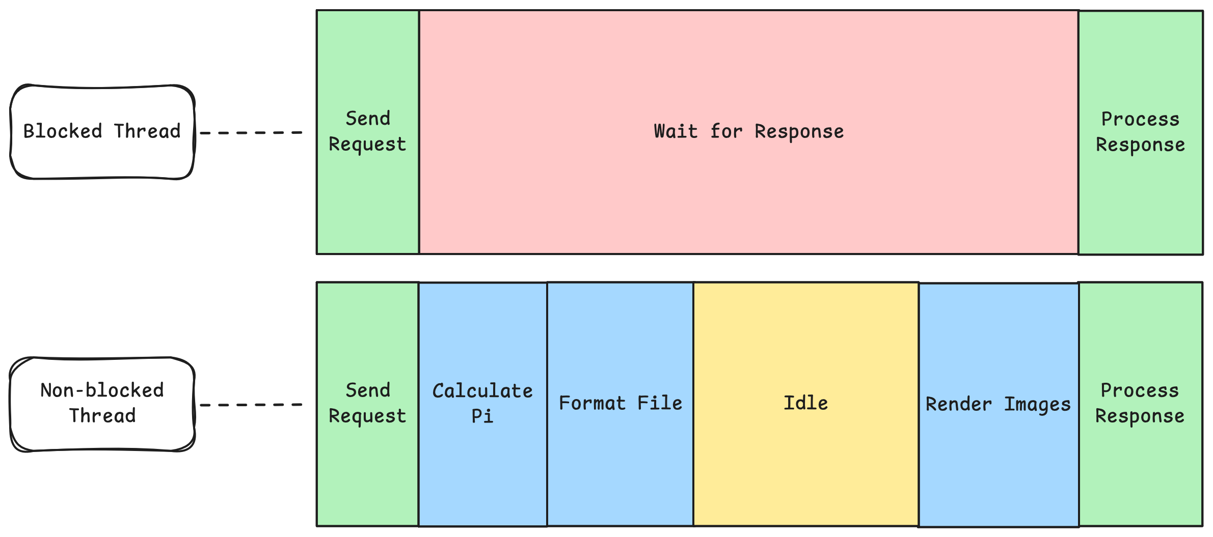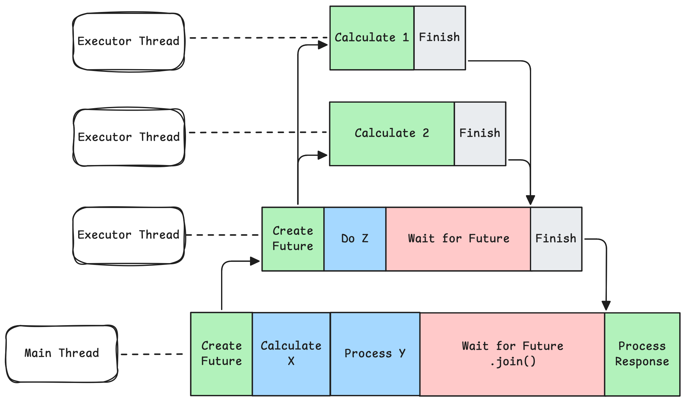 For now we have just considered a static blocking call, sleep(...). However, most of the blocking calls we typically use are I/O related. For example network I/O, where you send a request and wait for a response to come back. To write fully non-blocking code, you have to spin-up a thread for each step that has blocking logic (wait). You also need to write schedulers and coordinators to manage those jobs and make sure they are running with high concurrency and low latency. So, developers of Java said concurrency is really hard to manage manually, let's invent some construct that allows developers to write asynchronous code, and that's how Future is born.