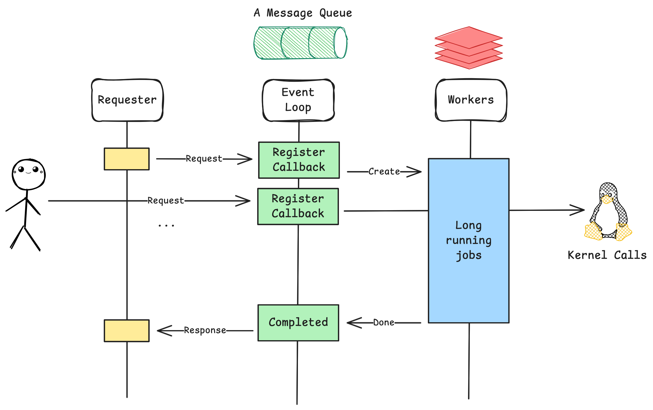 Inside this event loop, we are currently calling some get job between method to constantly check if a new job has arrived. This is not very efficient. Instead, we could use something like epoll_wait with io_uring ,which is a kernel call that blocks the thread until some change happens on a given file descriptor. Alternatively, if you are waiting messages to arrive in your message queue, you can use pthread_cond_signal with pthread_cond_wait, which allows a thread to wait until a signal is given. In this case, our event loop can wait if all messages are processed and while adding a message to the queue, we can call signal to wake up the event loop. Those kernel calls do it efficiently, so that you are not wasting CPU cycles while doing this wait.
