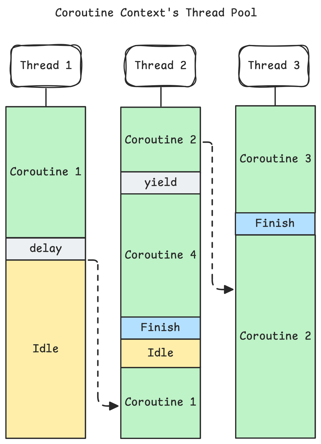 Instead of relying threads, which are expensive operating-system level constructs, Kotlin introduces coroutines, which are runtime-level lightweight constructs. Coroutines do still run on threads, but their execution is not strictly tied to a single thread, so they can switch threads during runtime. This flexibility makes them lightweight, similar to jobs submitted to the thread pools as we have shown in the first chapter. However, Kotlin has first-class support for coroutines using its language features, most importantly suspend.